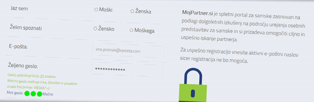 Izeri spol, ki ga želiš spoznati, vnesi svoj e-poštni naslov in določi geslo.