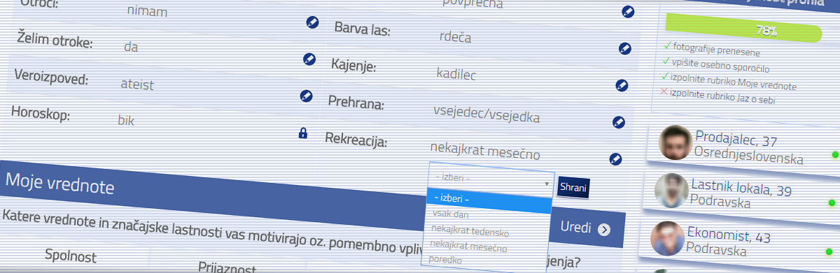 Pri izpolnjevanju profila bodite iskreni; izpolnite ga premišljeno, da boste pritegnili druge uporabnike in pri njih vzbudili interes, da vas spoznajo. Izpolnjen profil je vaše osebno oglasno sporočilo in osnova za dodane partnerske predloge.