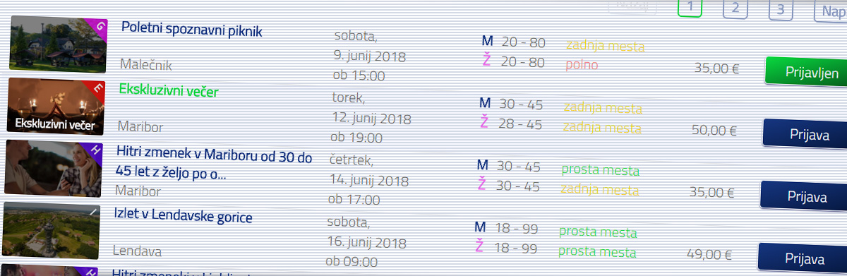 Po registraciji se lahko prijavite in se nam pridružite na naših spoznavnih tematskih dogodkih, potovanjih ali izletih. Spoznajte druge udeležence, ki prav tako iščejo novo ljubezen, romantiko ali prijateljstvo. Morda bo prav naslednji družabni dogodek za vas nepozaben.